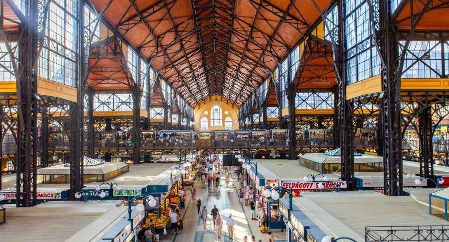 Inaugurado em 1897, este impressionante edifício neogótico se destaca por seu telhado de azulejos coloridos e uma grandiosa estrutura de aço no interior. O mercado oferece uma vasta seleção de iguarias húngaras e artesanato local.