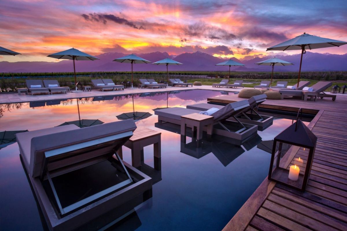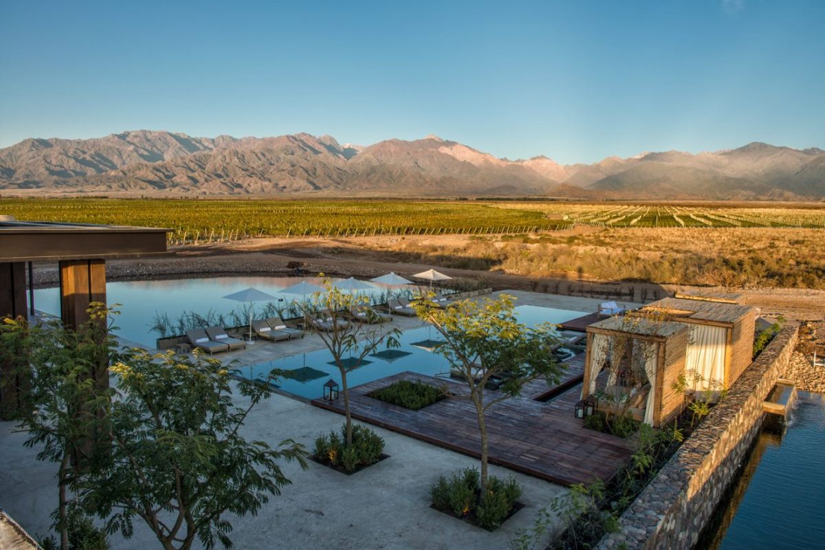 Cercado pelos vinhedos do Vale do Uco e com vista para a Cordilheira dos Andes, o The Vines Resort & Spa abriga 21 villas com lareiras externas, terraços panorâmicos e banheiros inspirados em spas. A proposta une gastronomia autoral – com o restaurante Siete Fuegos, de Francis Mallmann – a experiências como degustações, cavalgadas, trilhas e ioga ao ar livre. A piscina e o spa se integram à paisagem, criando um refúgio sereno e autêntico. A estrutura conta ainda com academia com vista para os vinhedos e o exclusivo Winemakers' Village. Um destino que revela a essência do enoturismo argentino com charme e personalidade.