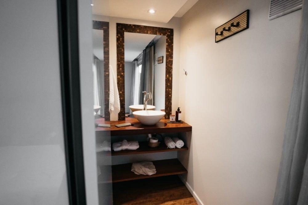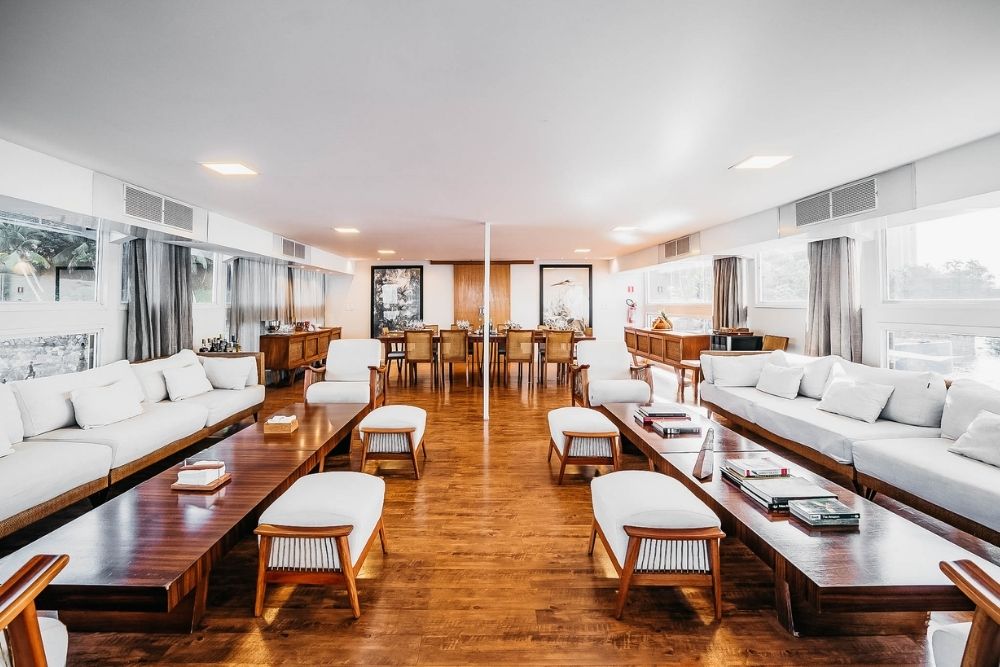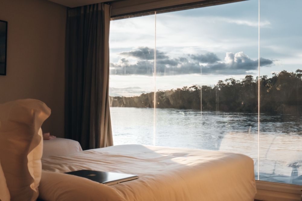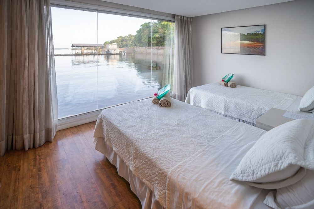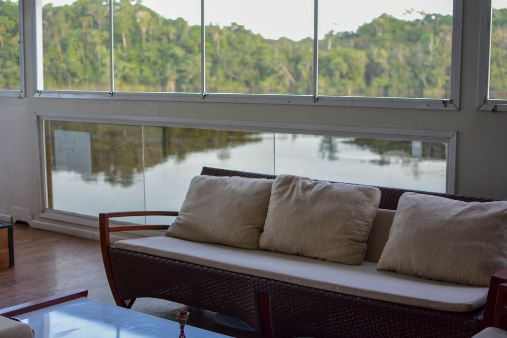 • Oito suítes climatizadas, seis com janelas panorâmicas para o rio e a floresta